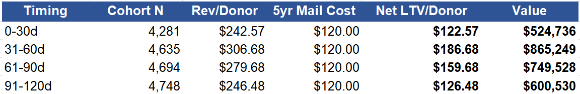 Here’s the 5-year net LTV by second gift timing: